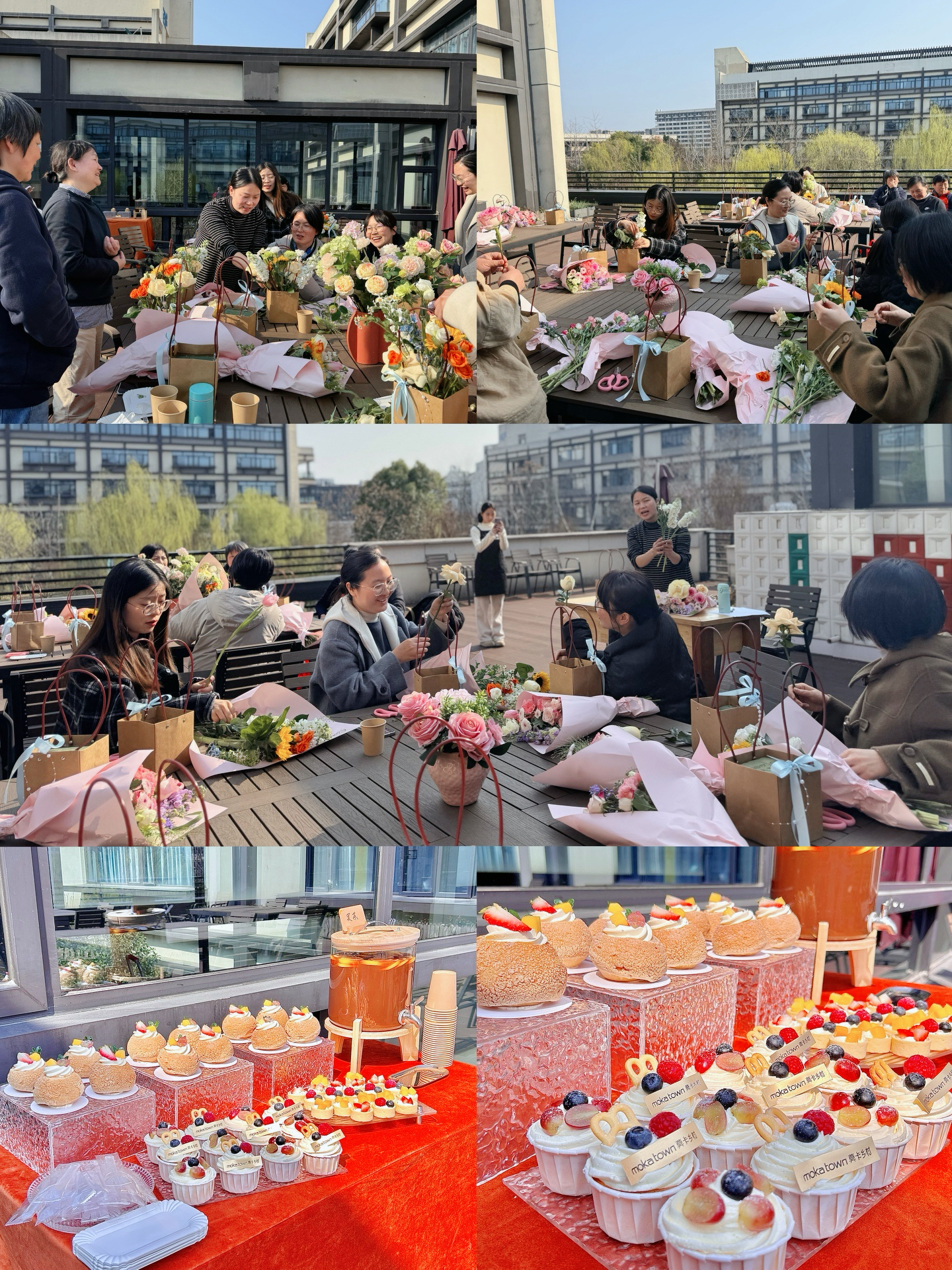 活动现场,露台上春意盎然,玫瑰、康乃馨、洋桔梗等鲜花整齐摆放,花香四溢。花艺老师从花材识别、色彩搭配到修剪技巧、造型设计进行了细致讲解。女教师们认真聆听,随后迫不及待地动手实践。她们发挥创造力,用心构思、精心搭配,将一朵朵鲜花错落有致地插入花篮。普通的花草经过巧手修剪,变成了一件件独具匠心的花艺作品。