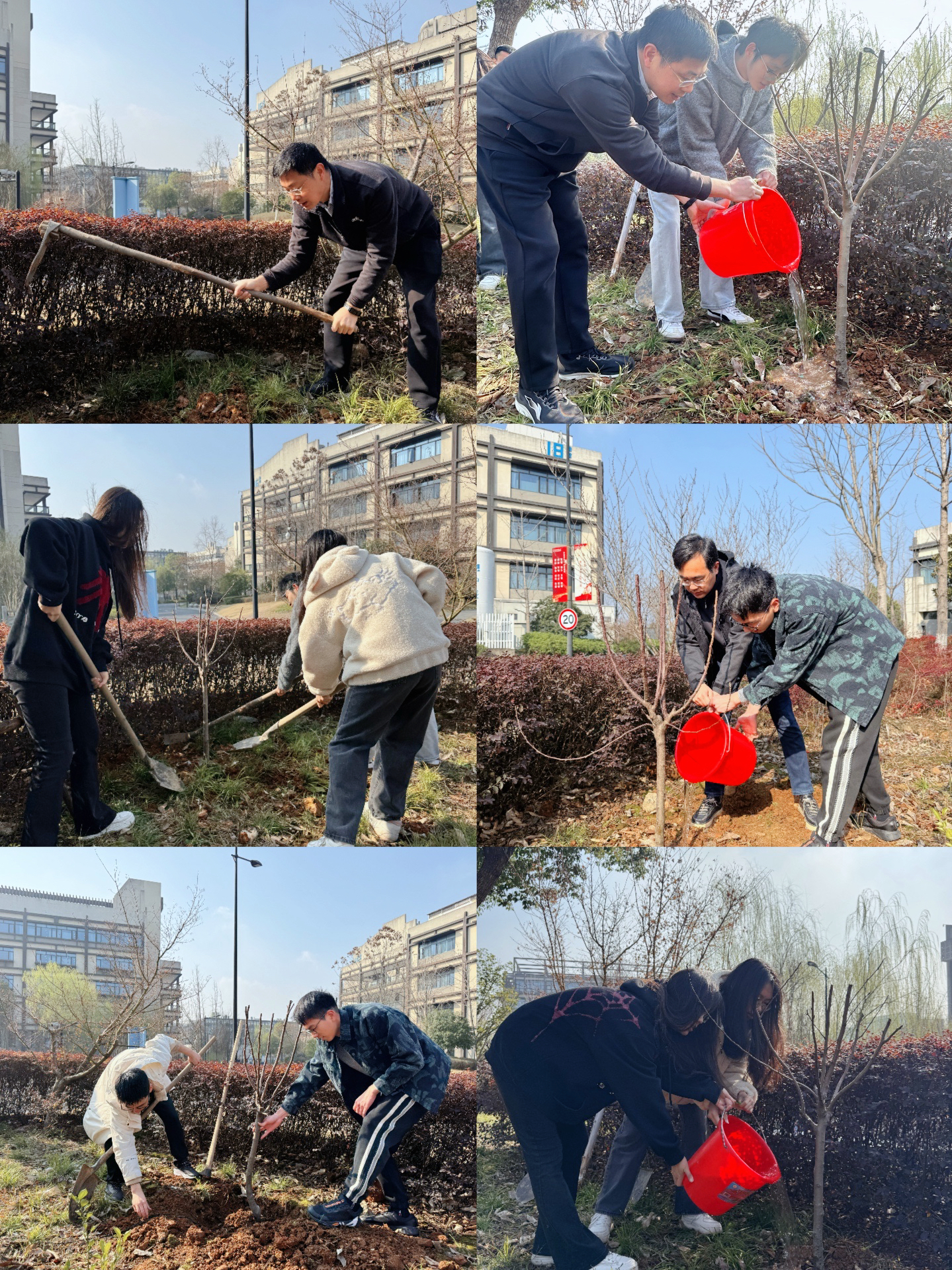 春风和煦,植树现场热火朝天。学院领导与同学们分工协作,挥锹铲土、扶苗填坑、提水浇灌,每一个环节都一丝不苟。在众人努力下,新栽的苹果树苗迎风挺立,焕发勃勃生机。“亲手种下这棵树,就像种下了对母校的眷恋。”参与活动的毕业生表示,这份特殊的毕业礼物意义非凡。