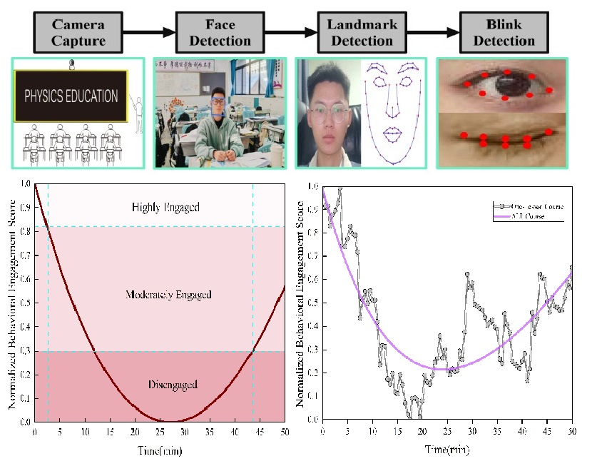 为实时监测大班教学注意力并指导干预,我们构建了基于多视角摄像系统的教师端平台,通过本地化计算学生眨眼率(教育心理学指标)生成实时注意力曲线。核心创新在于将注意力衰减建模为课堂事件(如铃声、教师干预)触发的随机过程。基于101节普通物理课的统计分析发现:课堂高注意力时段平均仅首尾各5分钟,显著低于教育心理学实验值(15分钟)。研究还量化评估了不同干预策略的注意力提升效果。进一步融合统计物理与机器学习方法:1) 开发情绪识别AI教师系统,通过面部表情与肢体动作的时序分析,实时检测学生困惑状态并提供精准反馈;2) 构建作业抄袭检测框架,对跨学生、跨章节的作业结果进行标准化特征提取,训练题目级抄袭预测模型。
